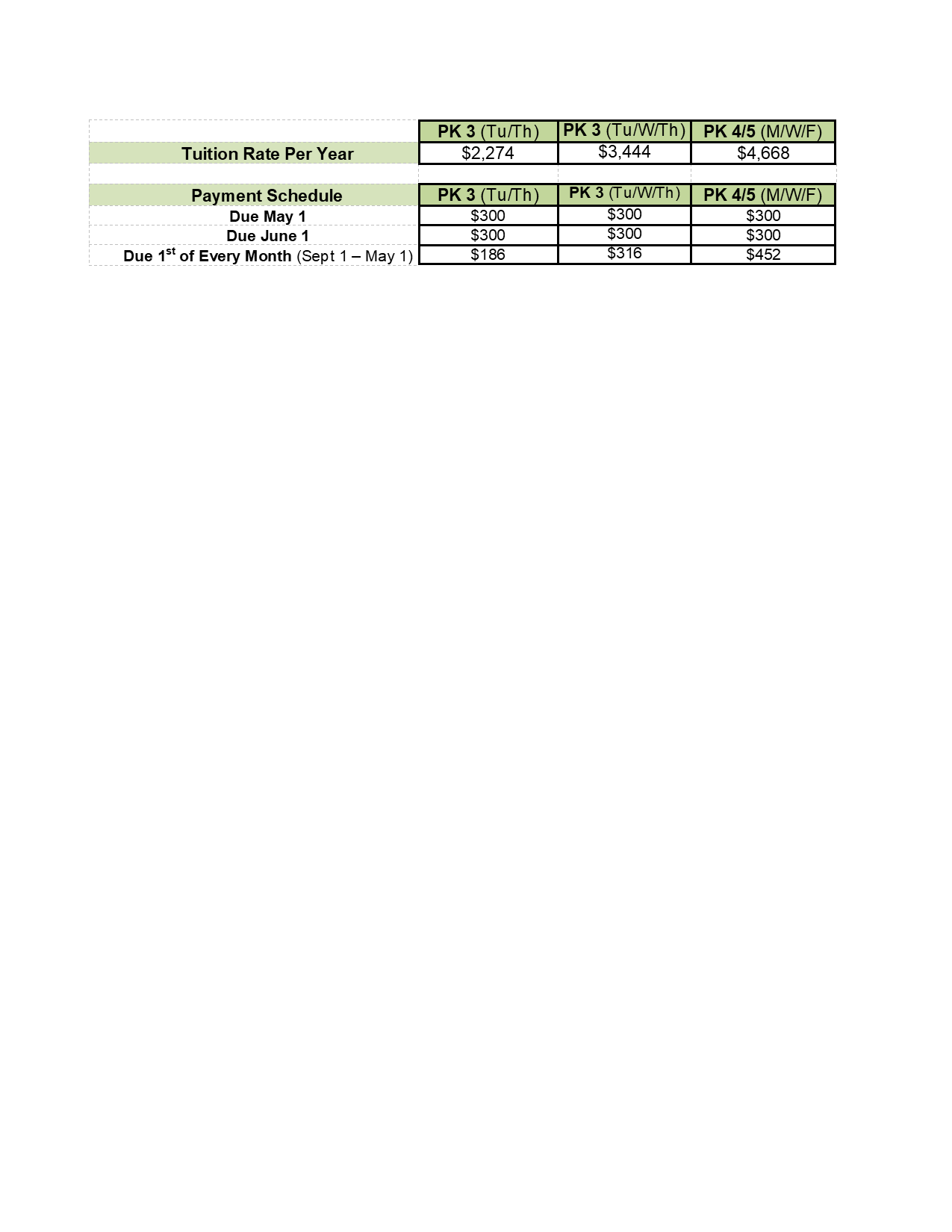 Pre-K 3 (Tu-W-Th) program: $3,444 (**LIMITED AVAILABILITY**)